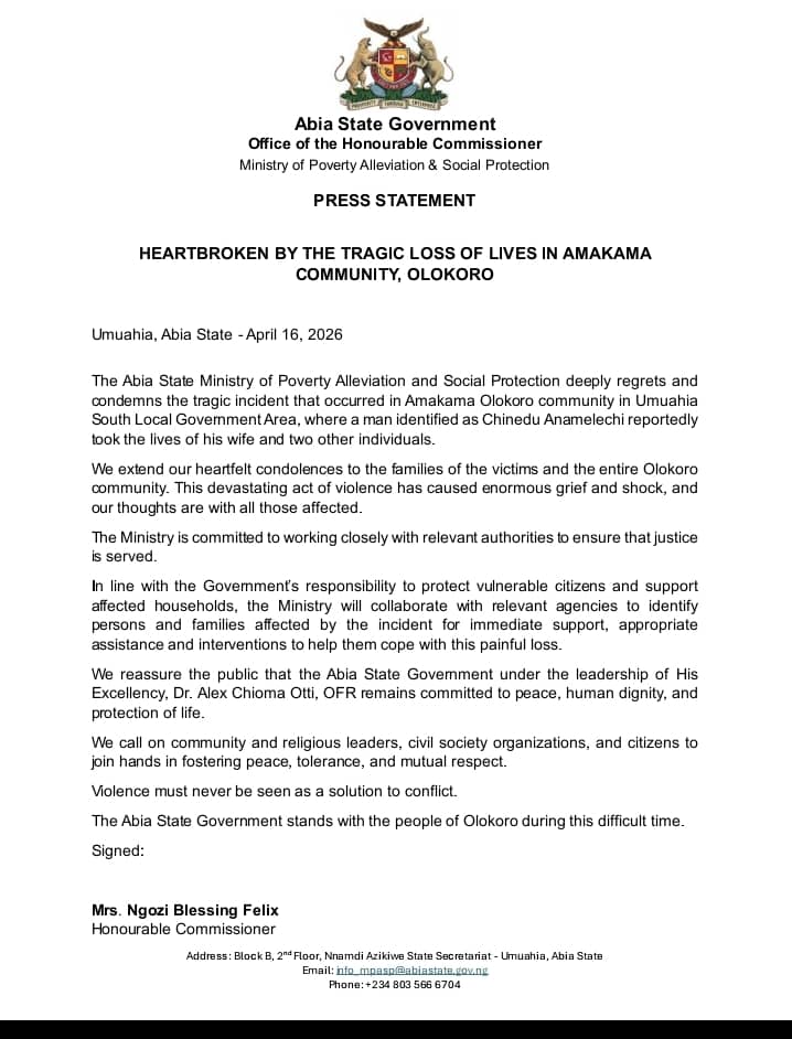 The Abia State Ministry of Poverty Alleviation and Social Protection has issued an official statement expressing deep sorrow and strong condemnation over the tragic loss of lives in Amakama, Olokoro community, located in Umuahia South Local Government Area.