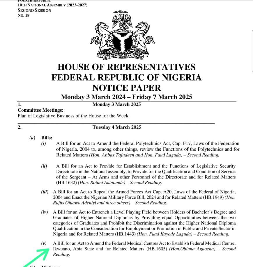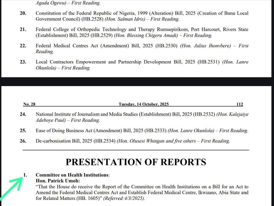 The bill, titled “A Bill for an Act to Amend the Federal Medical Centres Act and Establish Federal Medical Centre, Ikwuano, Abia State, and for Related Matters (HB. 1605),” was first referred to the committee on March 4, 2025. After extensive deliberations, it successfully passed its third reading in the House, marking a significant milestone in the legislative process.