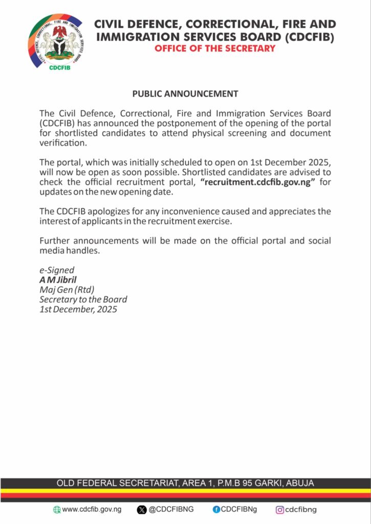 The portal, which had been slated to launch on 1 December 2025, will now open at a later date. According to the Board, the adjustment is necessary, and a new date will be communicated shortly. Applicants have been encouraged to monitor the official recruitment portal at “recruitment.cdcfib.gov.ng” for updates and further directives.