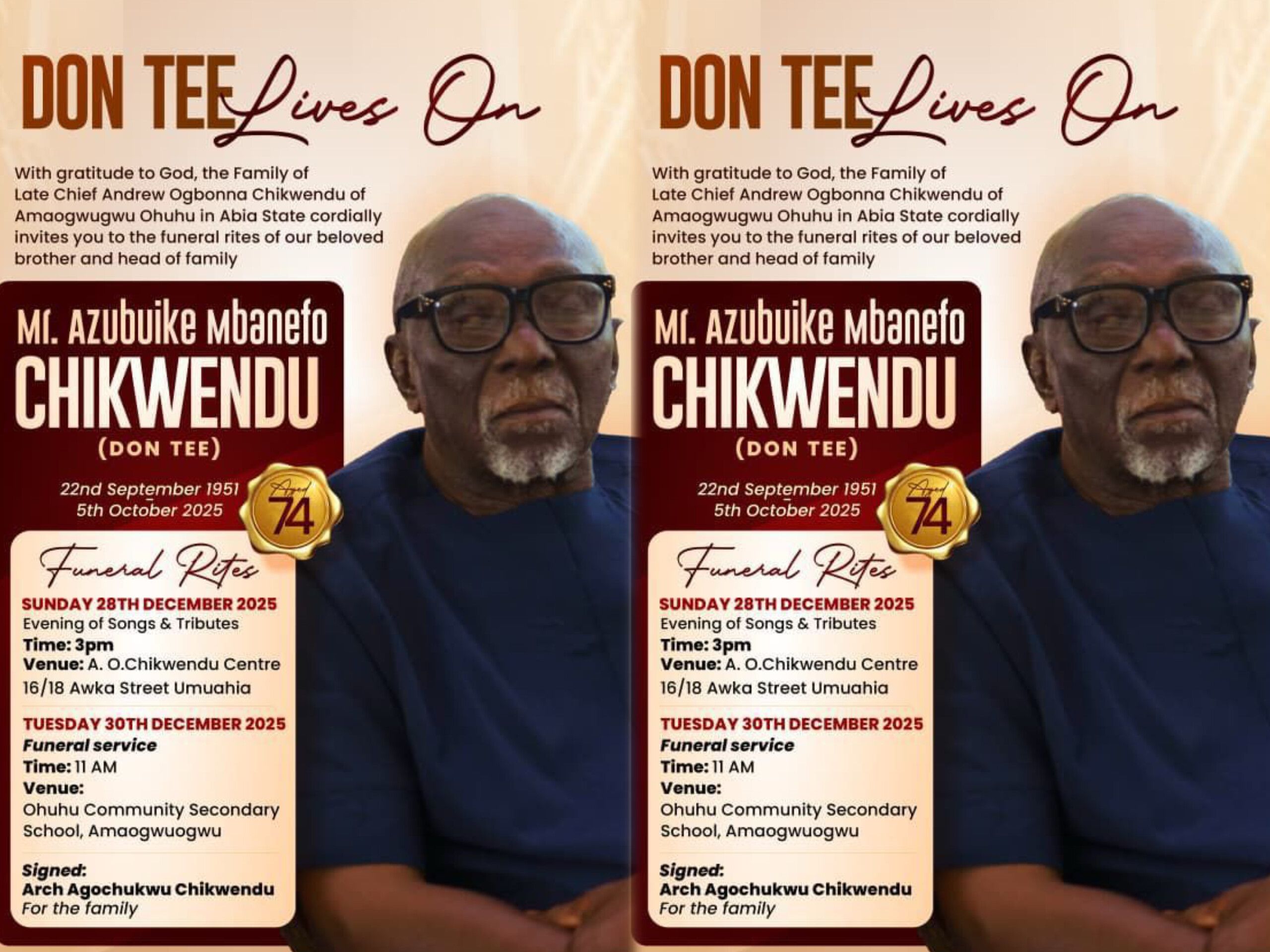 Mr. Chikwendu, who hailed from the family of Chief (Late) Andrew Ogbonna Chikwendu, departed this life on 5 October 2025 in Umuahia after a brief illness. Until his passing, he served as the Head of the Chikwendu Family and President of the A. O. Chikwendu Foundation, where he was widely respected for his leadership, commitment to community development, and dedication to humanitarian service.