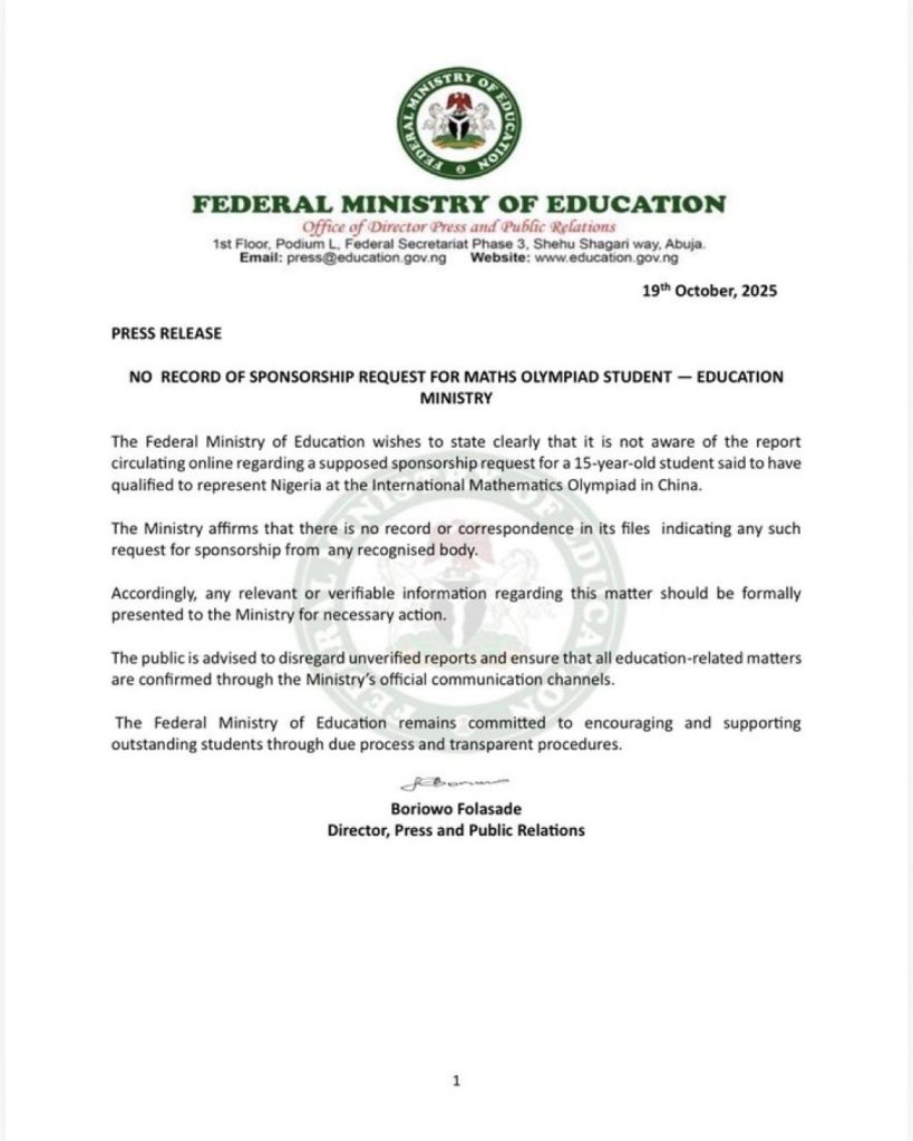 The Federal Ministry of Education has clarified that it has no record of any sponsorship request related to a 15-year-old student allegedly selected to represent Nigeria at the upcoming International Mathematics Olympiad (IMO) in China.