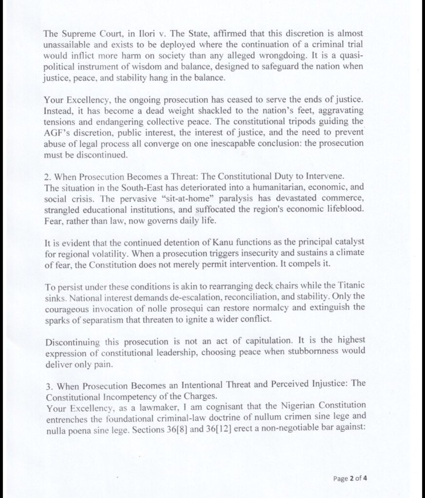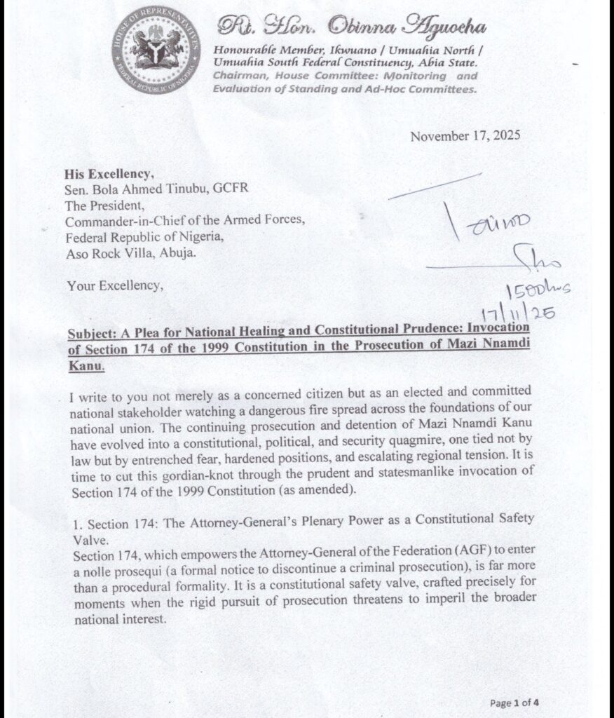 The lawmaker made the plea in a detailed letter dated November 17, 2025, emphasizing that the prolonged prosecution of the detained IPOB leader has deepened division, heightened insecurity, and strained national cohesion. According to Aguocha, invoking Section 174 of the 1999 Constitution, which grants the Attorney-General of the Federation the authority to enter a nolle prosequi, is essential for restoring peace and safeguarding national stability.