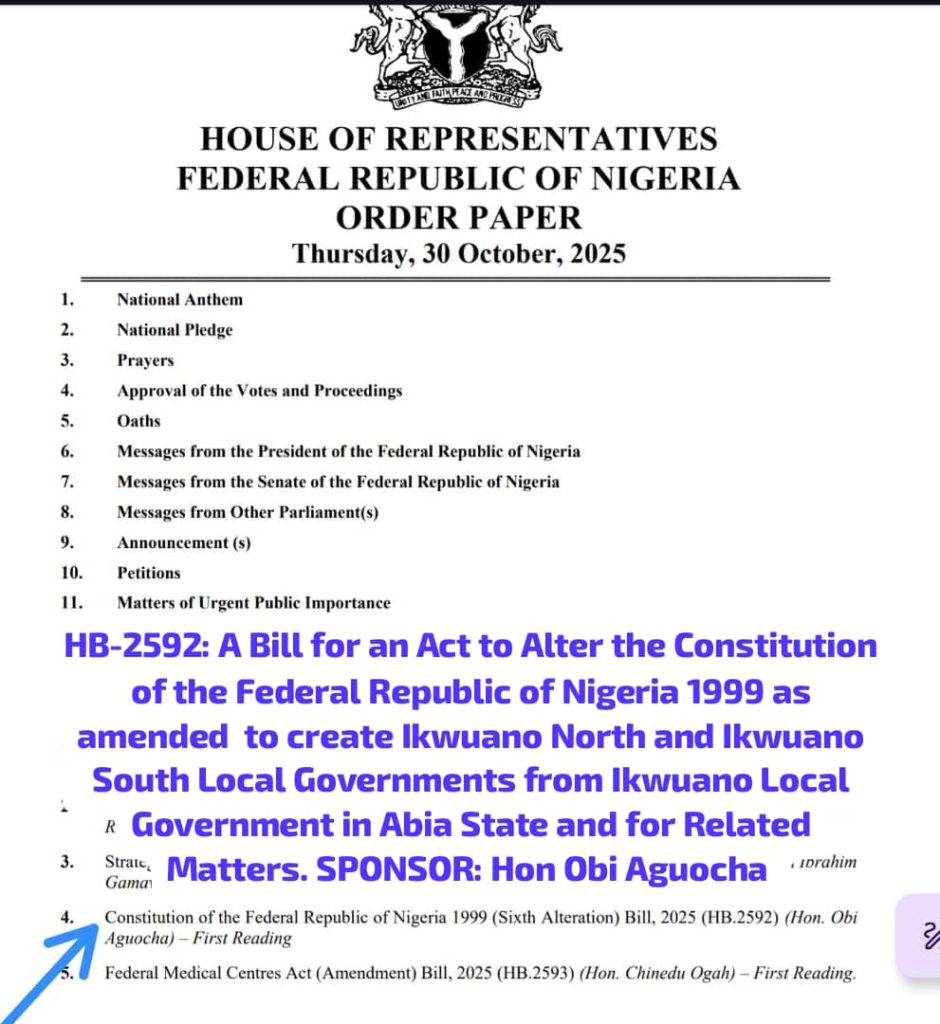 A new step toward strengthening grassroots governance in Abia State has been taken as Hon. Obi Aguocha, representing Ikwuano/Umuahia North/Umuahia South Federal Constituency, presented the Constitution of the Federal Republic of Nigeria (Sixth Alteration) Bill, 2025 (HB.2592), which has now passed its first reading in the House of Representatives.