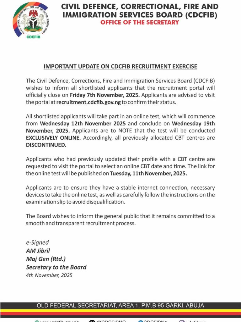 According to the latest notice from the Office of the Secretary, the CDCFIB recruitment portal recruitment.cdcfib.gov.ng will officially close on Friday, November 7, 2025. All applicants are strongly advised to visit the portal before the deadline to confirm their application status.
