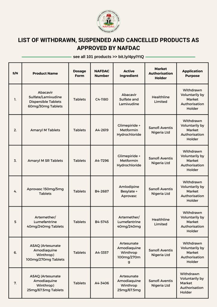 The full list of the 101 withdrawn, suspended, and cancelled products can be accessed on NAFDAC’s official website.