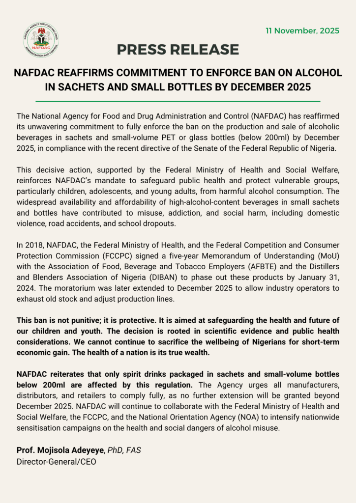 The National Agency for Food and Drug Administration and Control (NAFDAC) has reaffirmed its commitment to fully enforce the ban on the production and sale of alcoholic beverages in sachets and bottles smaller than 200 milliliters by December 2025.