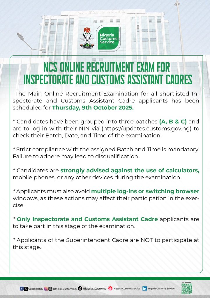 NCS announces online exam for shortlisted Inspectorate and Customs Assistant Cadres on October 9, 2025.