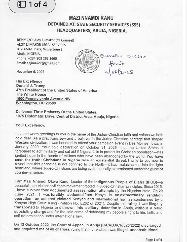 In the letter, dated November 6, and delivered through the U.S. Embassy in Abuja, Kanu appeals to Trump to intervene diplomatically in what he describes as a humanitarian and constitutional crisis affecting Christians and the Igbo population in Nigeria. Kanu, who has been in the custody of the Department of State Services (DSS) following his controversial rendition from Kenya in 2021, maintains his innocence and insists that his struggle is rooted in peaceful self-determination.