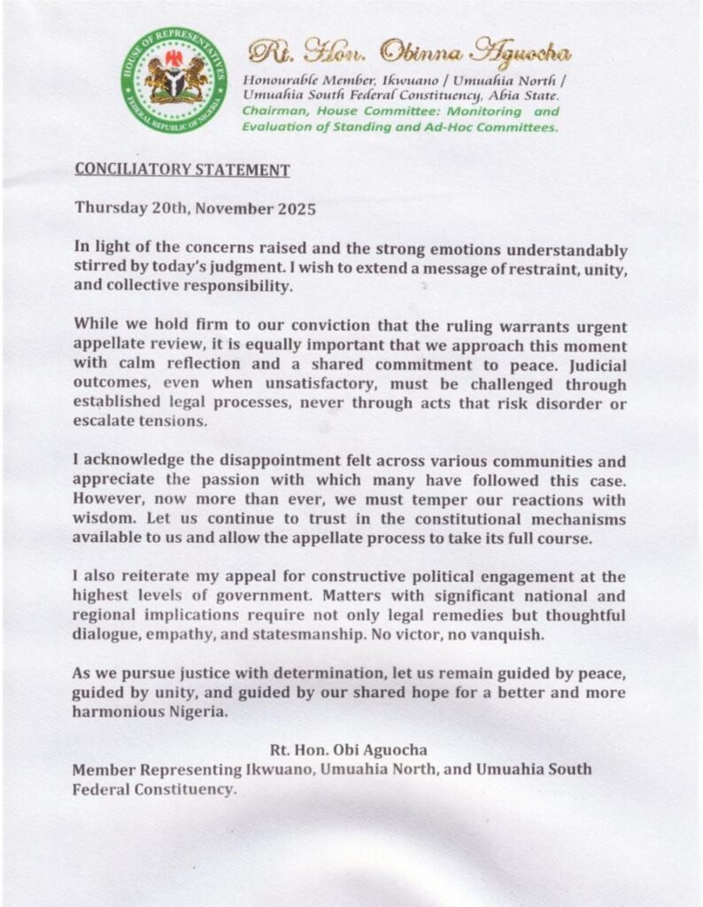 Hon. Obi Aguocha, Member representing Ikwuano, Umuahia North, and Umuahia South Federal Constituency, has released a measured and conciliatory statement in response to the intense public reactions that followed today’s controversial court judgment.